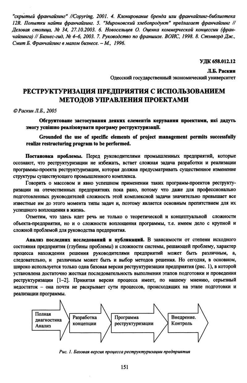 Раскин Л. Б. Реструктуризация предприятия с использованием методов управления проектами / Л. Б. Раскин // Вісник Національного університету “Львівська політехніка”. — Львів : Видавництво Національного університету “Львівська політехніка”, 2005. — № 526 : Логістика. — С. 151–155. — (Теорія логістики і маркетингу).