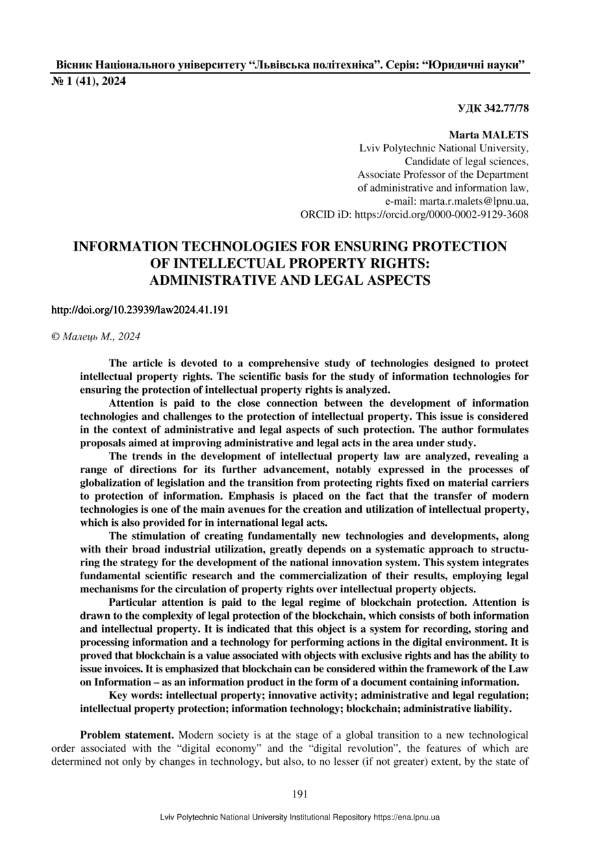 Malets M. Information technologies for ensuring protection of intellectual property rights: administrative and legal aspects / Malets Marta // Bulletin of Lviv Polytechnic National University. Series: Legal Sciences. — Lviv : Lviv Politechnic Publishing House, 2024. — No 1(41). — P. 191–198.