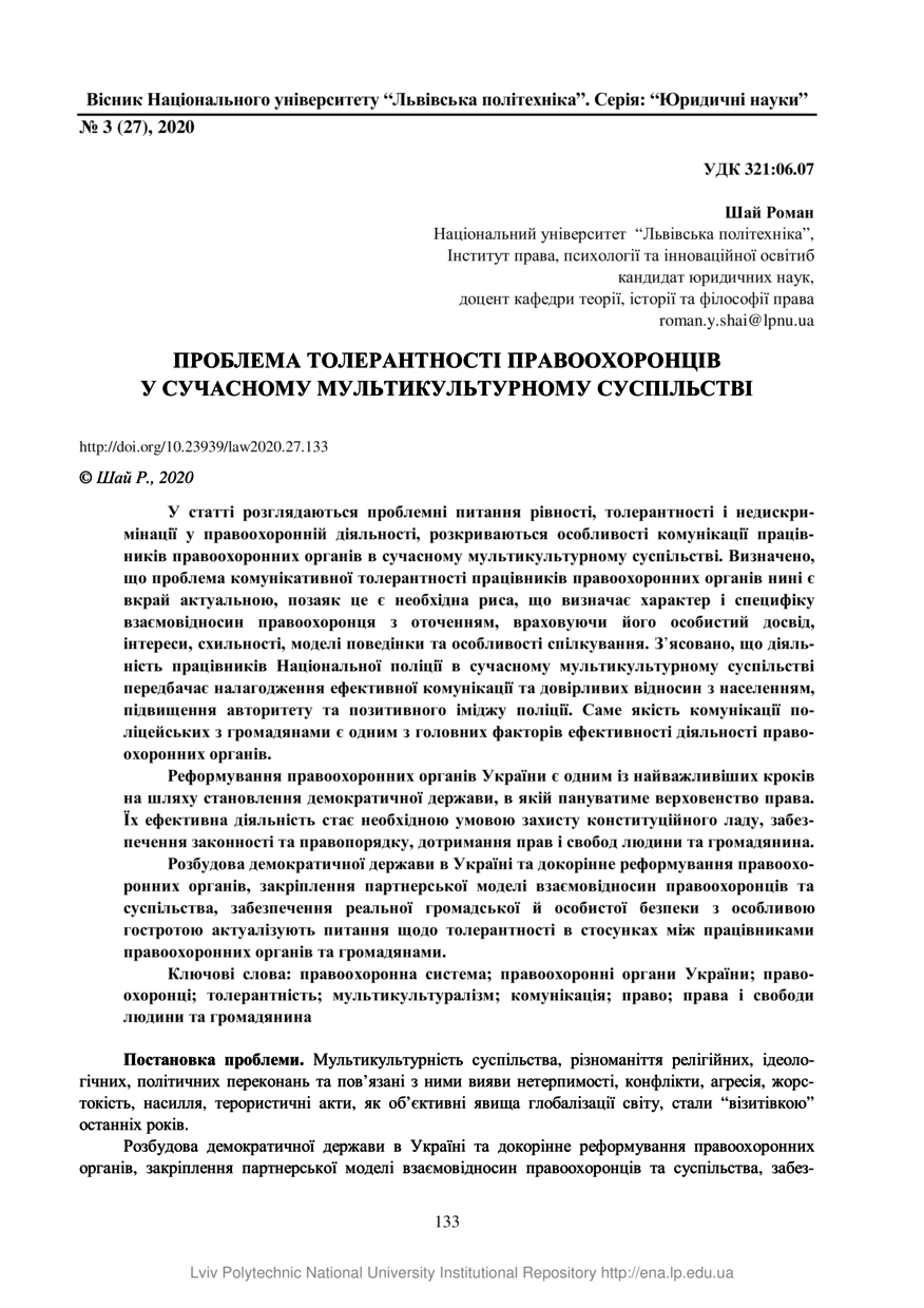 Шай Р. Проблема толерантності правоохоронців у сучасному мультикультурному суспільстві / Роман Шай // Вісник Національного університету “Львівська політехніка”. Серія: Юридичні науки. — Львів : Видавництво Львівської політехніки, 2020. — Том 7. — № 3 (27). — С. 133–138.