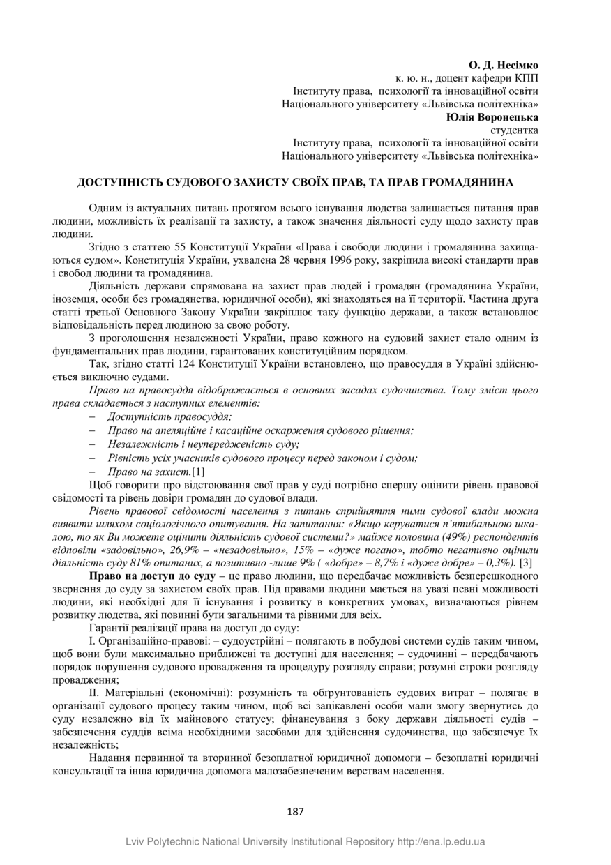 Несімко О. Д. Доступність судового захисту своїх прав, та прав громадянина / О. Д. Несімко, Юлія Воронецька // Захист прав і свобод людини та громадянина в умовах формування правової держави : збірник тез ІХ Всеукраїнської науково-практичної конференції, 30 травня 2020 року, Львів. — Львів : Видавництво Львівської політехніки, 2020. — С. 187–188. — (Кримінально-правові аспекти захисту прав і свобод людини та громадянина в умовах формування правової держави).