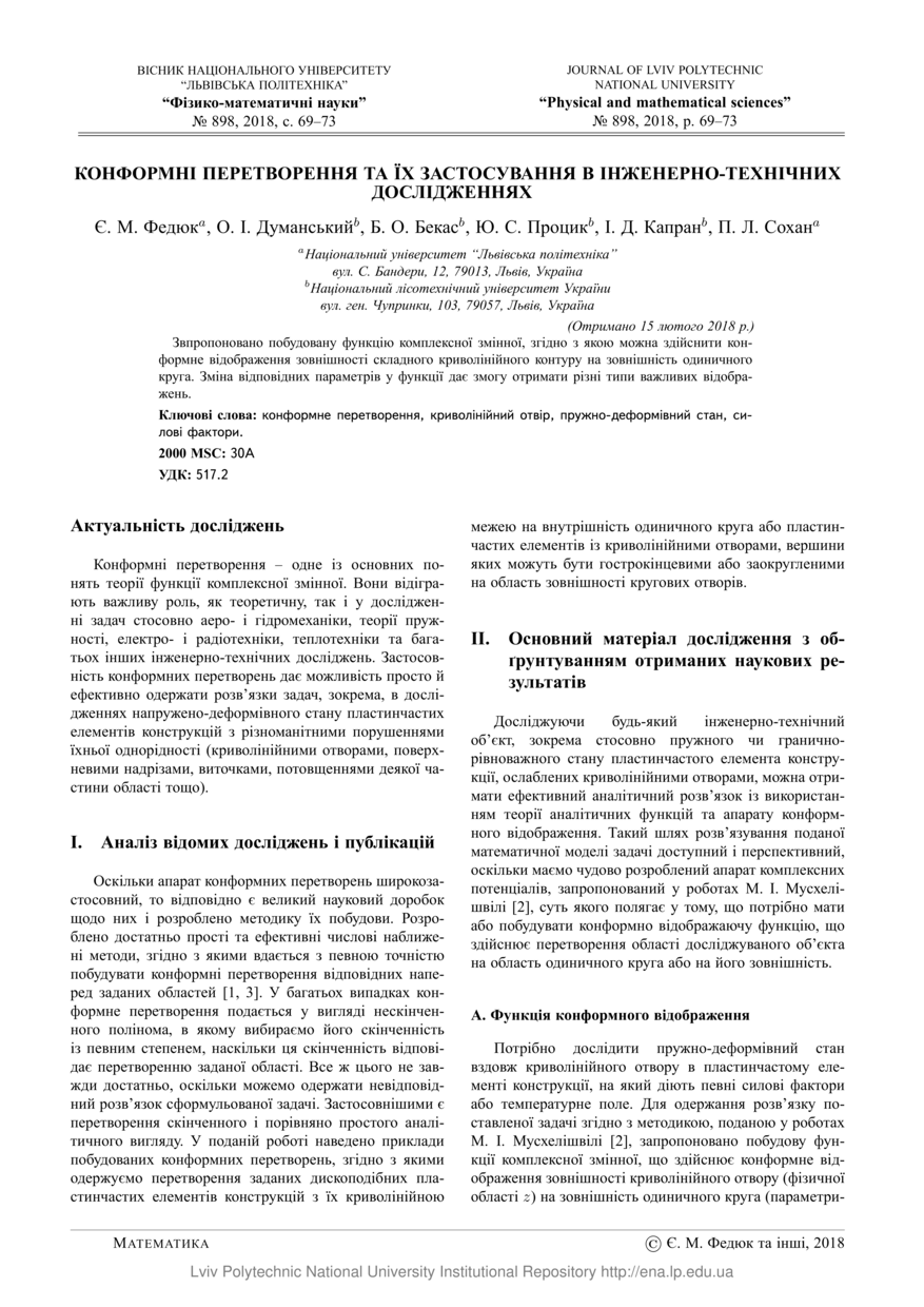 Конформні перетворення та їх застосування в інженерно-технічних дослідженнях / Є. М. Федюк, О. І. Думанський, Б. О. Бекас, Ю. С. Процик, І. Д. Капран, П. Л. Сохан // Вісник Національного університету “Львівська політехніка”. Серія: Фізико-математичні науки. — Львів : Видавництво Львівської політехніки, 2018. — № 898. — С. 69–73. — (Математика).