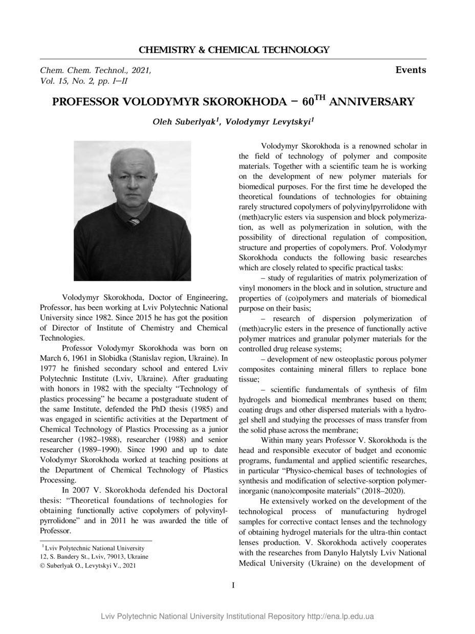 Suberlyak O. Professor Volodymyr Skorokhoda – 60th anniversary / Oleh Suberlyak, Volodymyr Levytskyi // Chemistry & Chemical Technology. — Lviv : Lviv Politechnic Publishing House, 2021. — Vol 15. — No 2. — P. 319–320.