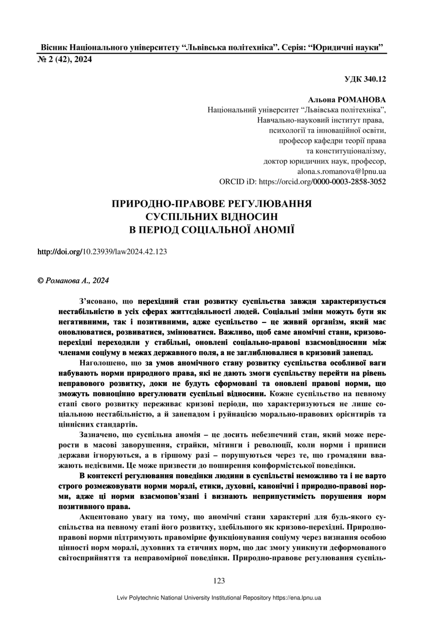 Романова А. Природно-правове регулювання суспільних відносин в період соціальної аномії / Альона Романова // Вісник Національного університету “Львівська політехніка”. Серія: Юридичні науки. — Львів : Видавництво Львівської політехніки, 2024. — № 2 (42). — С. 123–127.