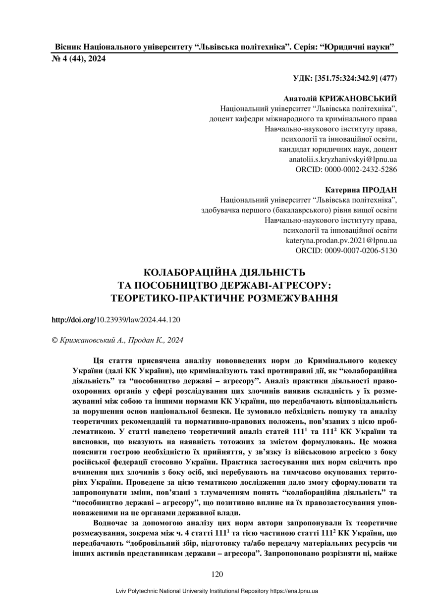 Крижановський А. Колабораційна діяльність та пособництво державі-агресору: теоретико-практичне розмежування / Анатолій Крижановський, Катерина Продан // Вісник Національного університету “Львівська політехніка”. Серія: “Юридичні науки”. — Львів : Видавництво Львівської політехніки, 2024. — № 4(44). — С. 120–125.