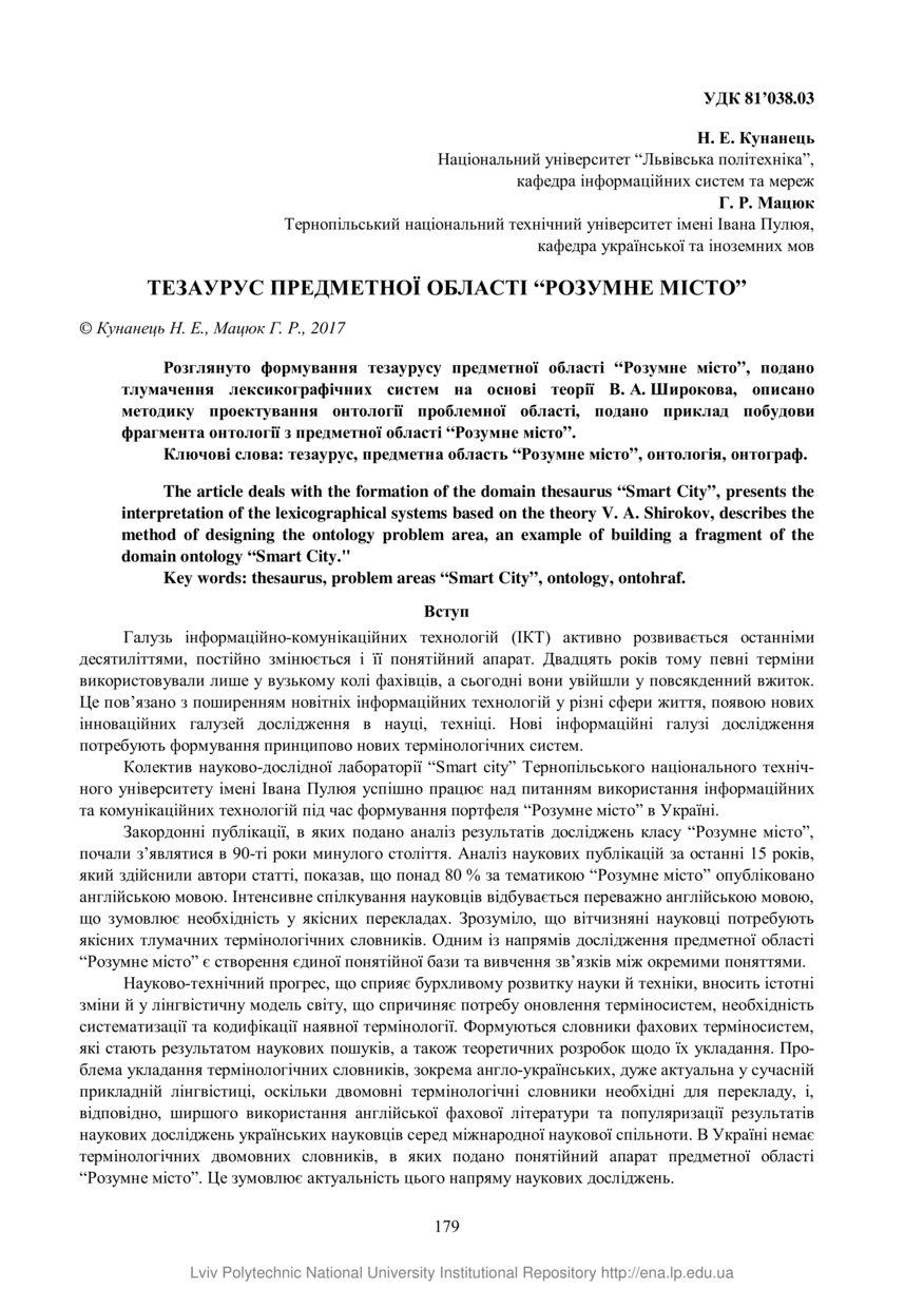 Кунанець Н. Е. Тезаурус проблемної області “Розумне місто” / Н. Е. Кунанець, Г. Р. Мацюк // Вісник Національного університету «Львівська політехніка». Серія: Інформаційні системи та мережі. — Львів : Видавництво Львівської політехніки, 2017. — № 872. — С. 179–189.