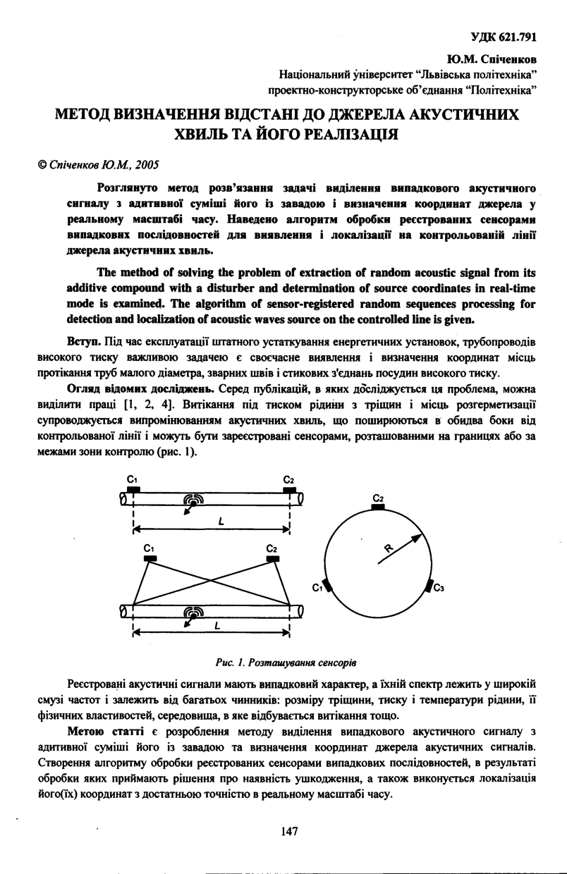 Спіченков Ю. М. Метод визначення відстані до джерела акустичних хвиль та його реалізація / Ю. М. Спіченков // Вісник Національного університету “Львівська політехніка”. — Львів : Видавництво Національного університету “Львівська політехніка”, 2005. — № 546 : Комп’ютерні системи та мережі. — С. 147–154.