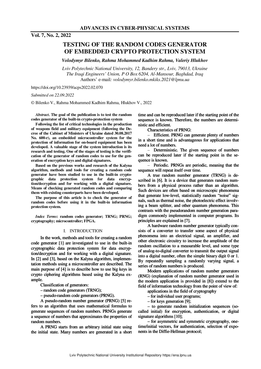 Bilenko V. Testing of the Random Codes Generator of Embedded Crypto Protection System / V. Bilenko, R. M. K. Rahma, V. Hlukhov // Advances in Cyber-Physical Systems. — Lviv : Lviv Politechnic Publishing House, 2022. — Vol 7. — No 2. — P. 70–75.