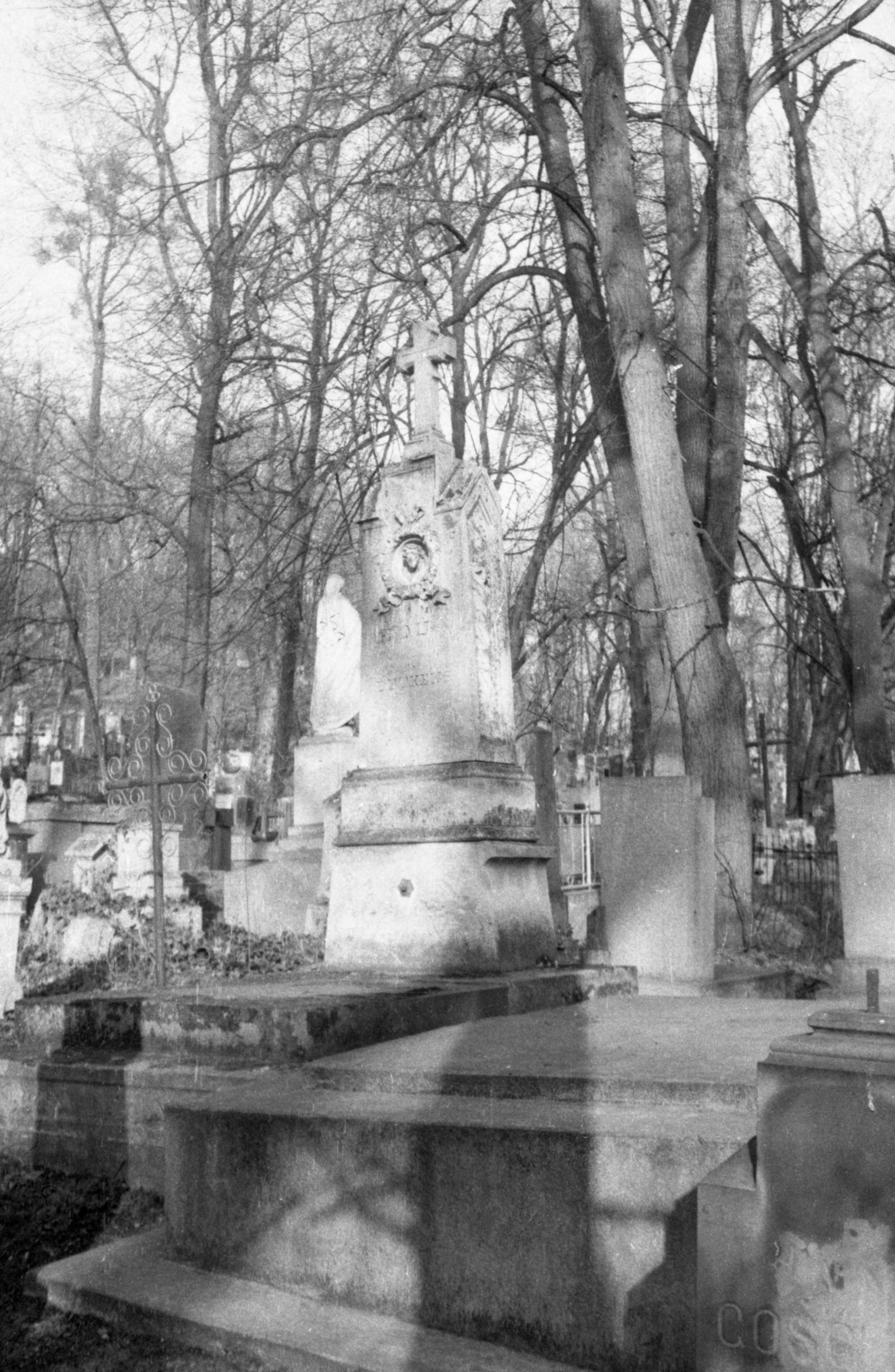 На світлині — гробівець на постаменті якого — висока стела з барельєфним портретом покійного та інскрипцією про нього, увінчана хрестом.