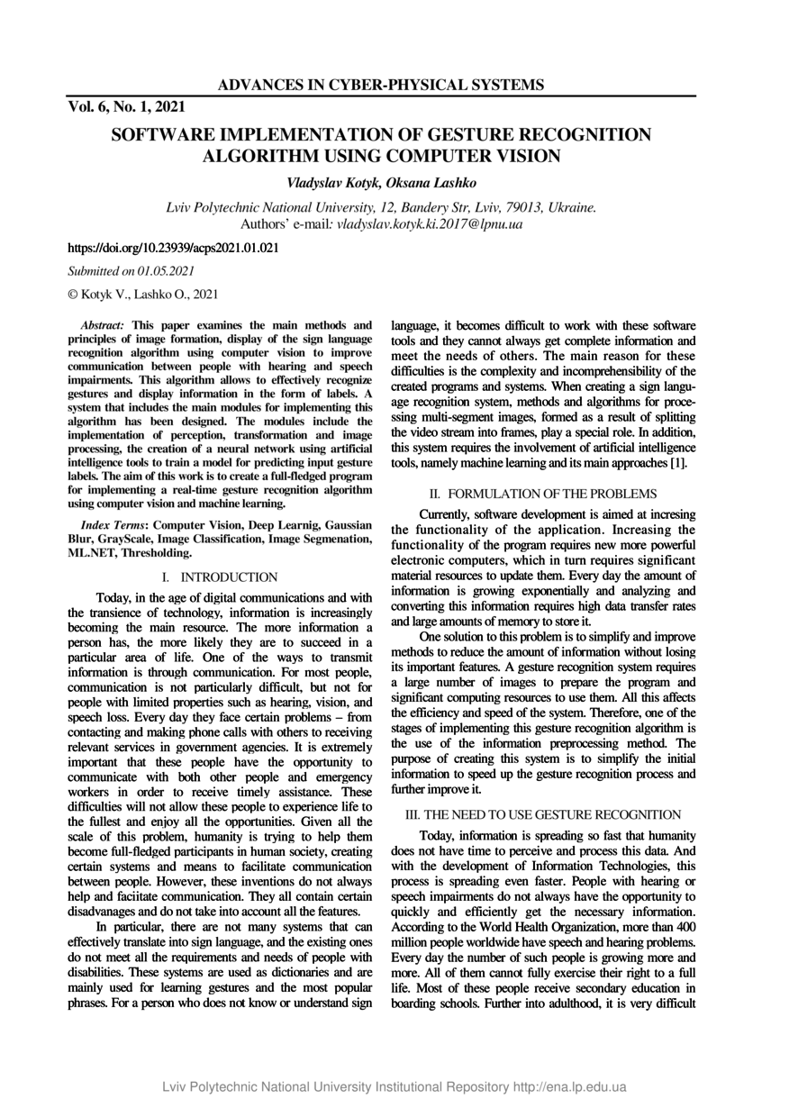 | dc.identifier.citation | Kotyk V. Software Implementation of Gesture Recognition Algorithm Using Computer Vision / Vladyslav Kotyk, Oksana Lashko // Advances in Cyber-Physical Systems. — Lviv : Lviv Politechnic Publishing House, 2021. — Vol 6. — No 1. — P. 21–26. | |