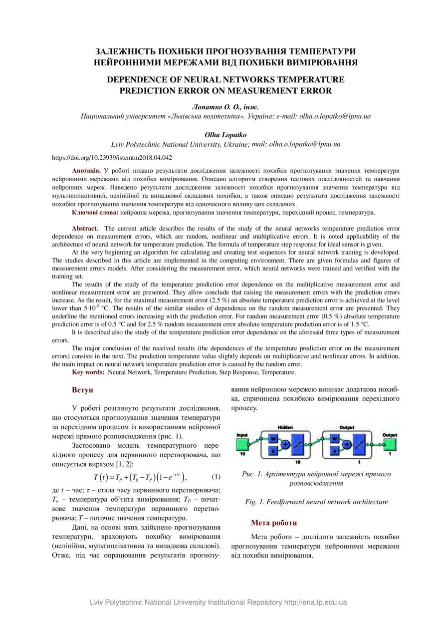 Лопатко О. О. Залежність похибки прогнозування температури нейронними мережами від похибки вимірювання / О. О. Лопатко // Вимірювальна техніка та метрологія : міжвідомчий науково-технічний збірник. — Львів : Видавництво Львівської політехніки, 2018. — Том 79. — № 4. — С. 42–46.