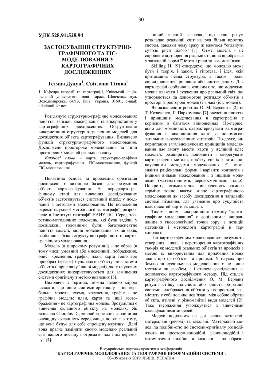 Дудун Т. Застосування структурно-графічного та ГІС-моделювання у картографічних дослідженнях / Тетяна Дудун, Світлана Тітова // Картографічне моделювання та географічні інформаційні системи : збірник матеріалів всеукраїнської науково-практичної конференції, 3–5 жовтня 2019 року, Львів. — Львів : Видавництво Львівської політехніки, 2019. — С. 30–34.