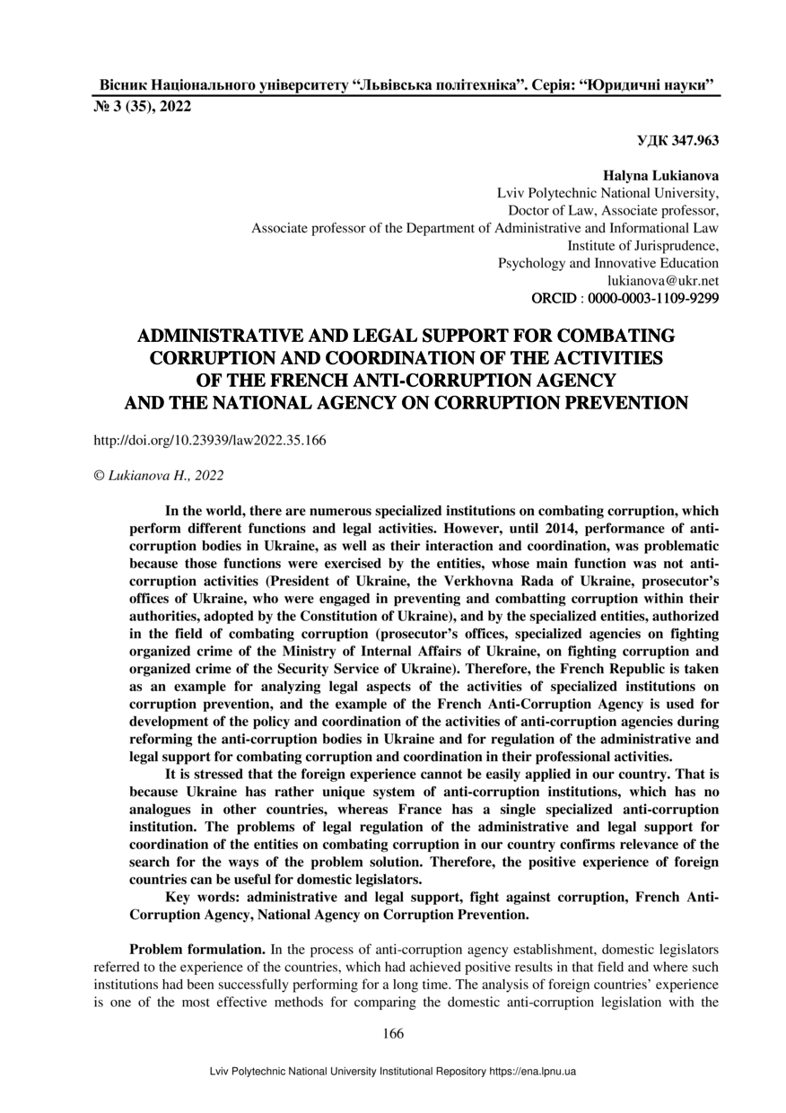 Lukianova H. Administrative and legal support for combating corruption and coordination of the activities of the french anti-corruption agency and the national agency on corruption prevention / Halyna Lukianova // Вісник Національного університету “Львівська політехніка”. Серія: “Юридичні науки”. — Lviv : Lviv Politechnic Publishing House, 2022. — Vol 9. — No 3 (35). — P. 166–170.