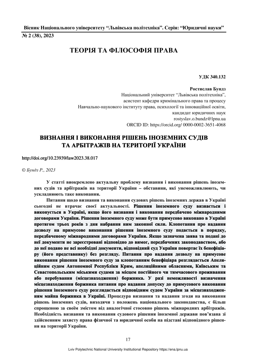 | dc.identifier.citation | Бундз Р. Визнання і виконання рішень іноземних судів та арбітражів на території України / Ростислав Бундз // Вісник Національного університету “Львівська політехніка”. Серія: “Юридичні науки”. — Львів : Видавництво Львівської політехніки, 2023. — № 2 (38). — С. 17–21. | |
