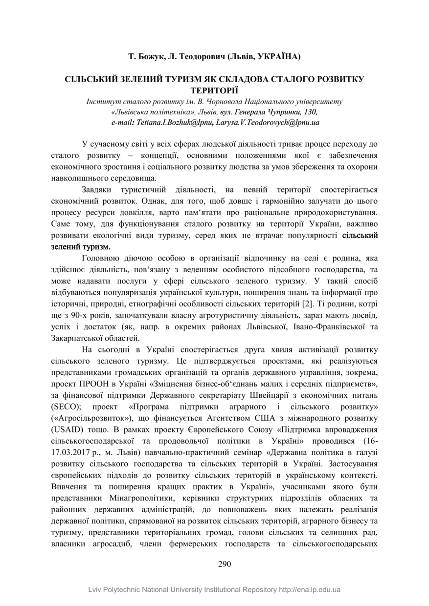 Божук Т. Сільський зелений туризм як складова сталого розвитку території / Т. Божук, Л. Теодорович // Сталий розвиток – стан та перспективи : матеріали міжнародного наукового симпозіуму SDEV‘2018, Львів-Славське, Україна, 28 лютого–3 березня 2018 року. — Львів : Панорама, 2018. — С. 290–291. — (Туризм як чинник сталого розвитку).