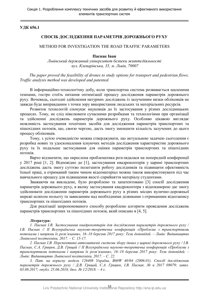 | dc.relation.referencesen | 1. Pasnak I.V. Zastosuvannia kvadrokopteriv dlia doslidzhennia parametriv dorozhnoho rukhu, I.V. Pasnak, II Vseukrainska naukovo-teoretychna konferentsiia "Problemy z transportnymy potokamy i napriamy yikh rozviazannia", 16–18 bereznia 2017 roku: Tezy dopovidei, Lviv: Vydavnytstvo Lvivskoi politekhniky, 2017, P. 15-17. | |