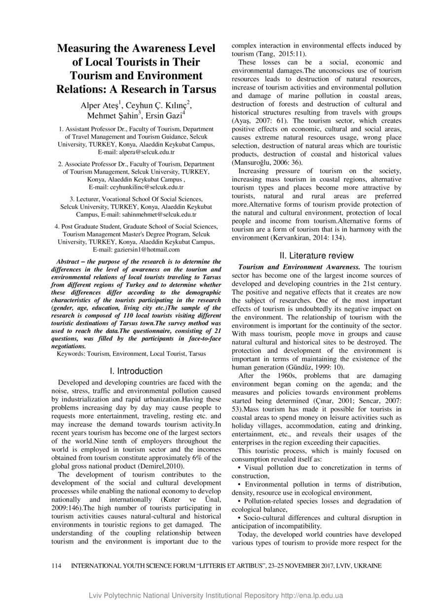 Measuring the awareness level of local tourists in their tourism and environment relations: a research in tarsus / Alper Ateş, Ceyhun Ç. Kılınç, Mehmet Şahin, Ersin Gazi // Litteris et Artibus : proceedings, 23–25 November, 2017. — Lviv : Lviv Polytechnic Publishing House, 2017. — P. 114–117. — (4th International academic conference «Environmental protection, natural resource management and tourism 2017» (EcoTour-2017)).
