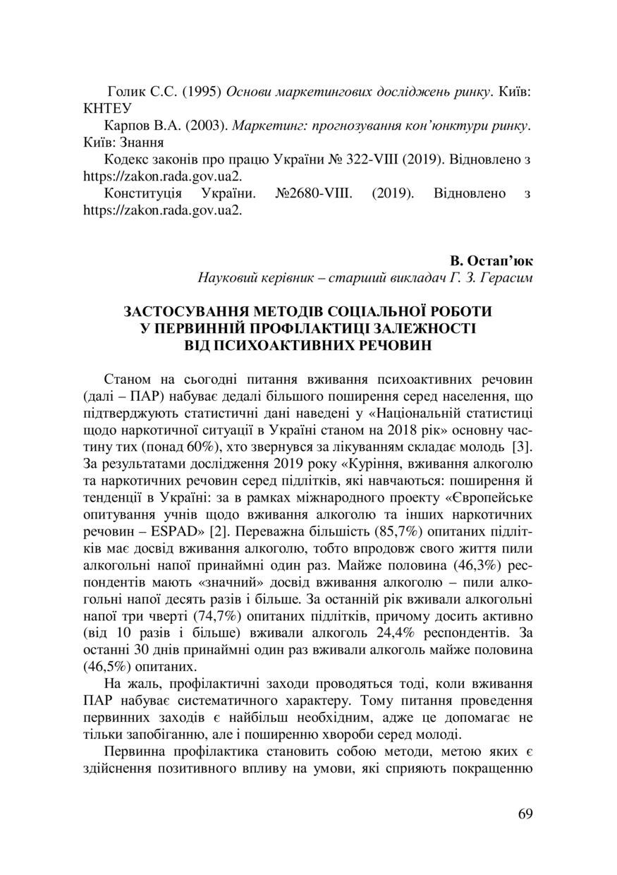 Остап’юк В. Застосування методів соціальної роботи у первинній профілактиці залежності від психоактивних речовин / В. Остап’юк, Г. З. Герасим // 77-ма Студентська науково-технічна конференція : збірник тез доповідей, жовтень, Львів. — Львів : Видавництво Львівської політехніки, 2019. — С. 69–71. — (Секція гуманітарних та соціальних наук).