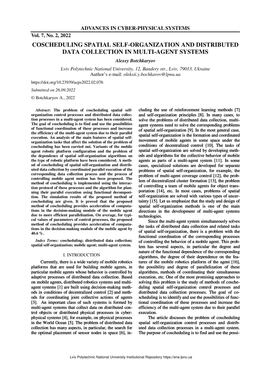 Botchkaryov A. Coscheduling Spatial Self-organization and Distributed Data Collection in Multi-agent System / A. Botchkaryov // Advances in Cyber-Physical Systems. — Lviv : Lviv Politechnic Publishing House, 2022. — Vol 7. — No 2. — P. 76–82.