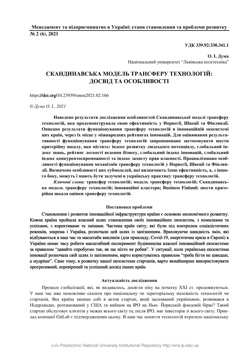 Дума О. І. Скандинавська модель трансферу технологій: досвід та особливості / О. І. Дума // Менеджмент та підприємництво в Україні: етапи становлення і проблеми розвитку : науковий журнал. — Львів : Видавництво Львівської політехніки, 2021. — Том 3. — № 2. — С. 166–180.