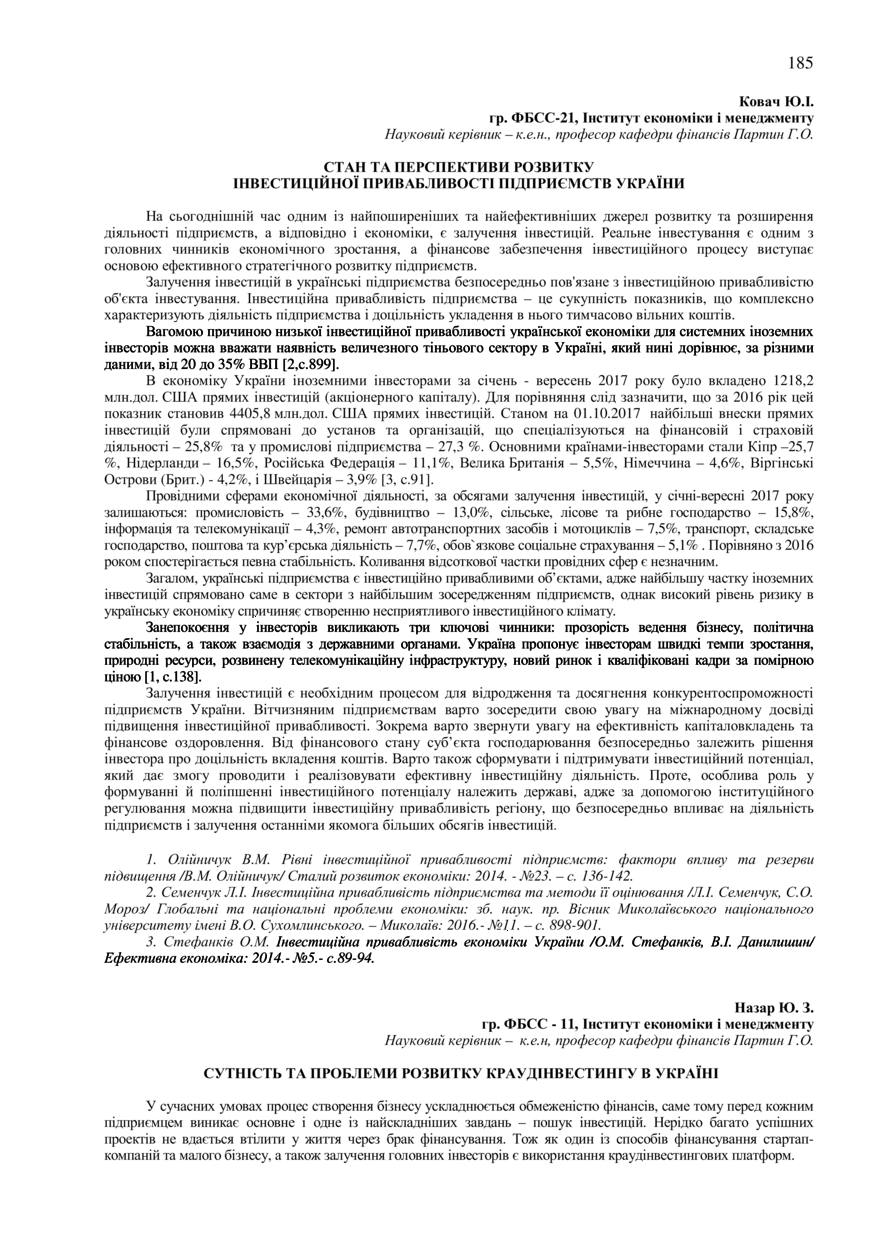 Назар Ю. З. Сутність та проблеми розвитку краудінвестингу в Україні / Ю. З. Назар, Г. О. Партин // 76-та Студентська науково-технічна конференція. Секція "Економіка і менеджмент" : збірник тез доповідей, жовтень – листопад 2018 року. — Львів : Видавництво Львівської політехніки, 2018. — С. 185–186. — (Особливості та перспективи розвитку корпоративних фінансів).
