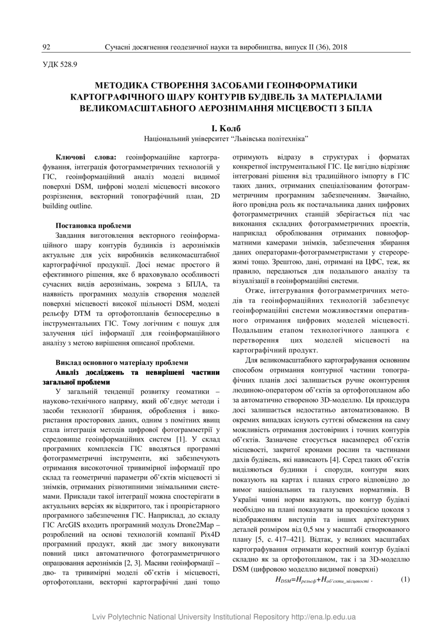 | dc.identifier.citation | Колб І. Методика створення засобами геоінформатики картографічного шару контурів будівель за матеріалами великомасштабного аерознімання місцевості з БПЛА / І. Колб // Сучасні досягнення геодезичної науки та виробництва : збірник наукових праць. — Львів : Видавництво Львівської політехніки, 2018. — Том 2 (36). — С. 92–96. | |