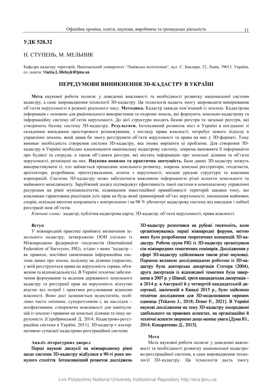 Ступень Н. Передумови виникнення 3D-кадастру в Україні / Н. Ступень, М. Мельник // Сучасні досягнення геодезичної науки та виробництва. — Львів : Видавництво Львівської політехніки, 2022. — Том ІІ (44). — С. 11–15.