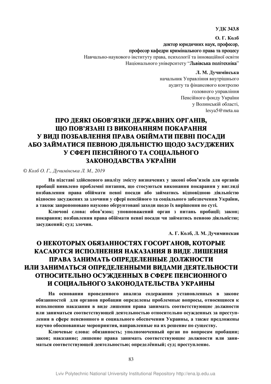 | dc.title.alternative | On some duties of the state authorities that relate to the execution of punishment in the form of deprivation of right hugging certain positions or engage certain activities on convicts in the sphere of pension and social legislation of Ukraine | |