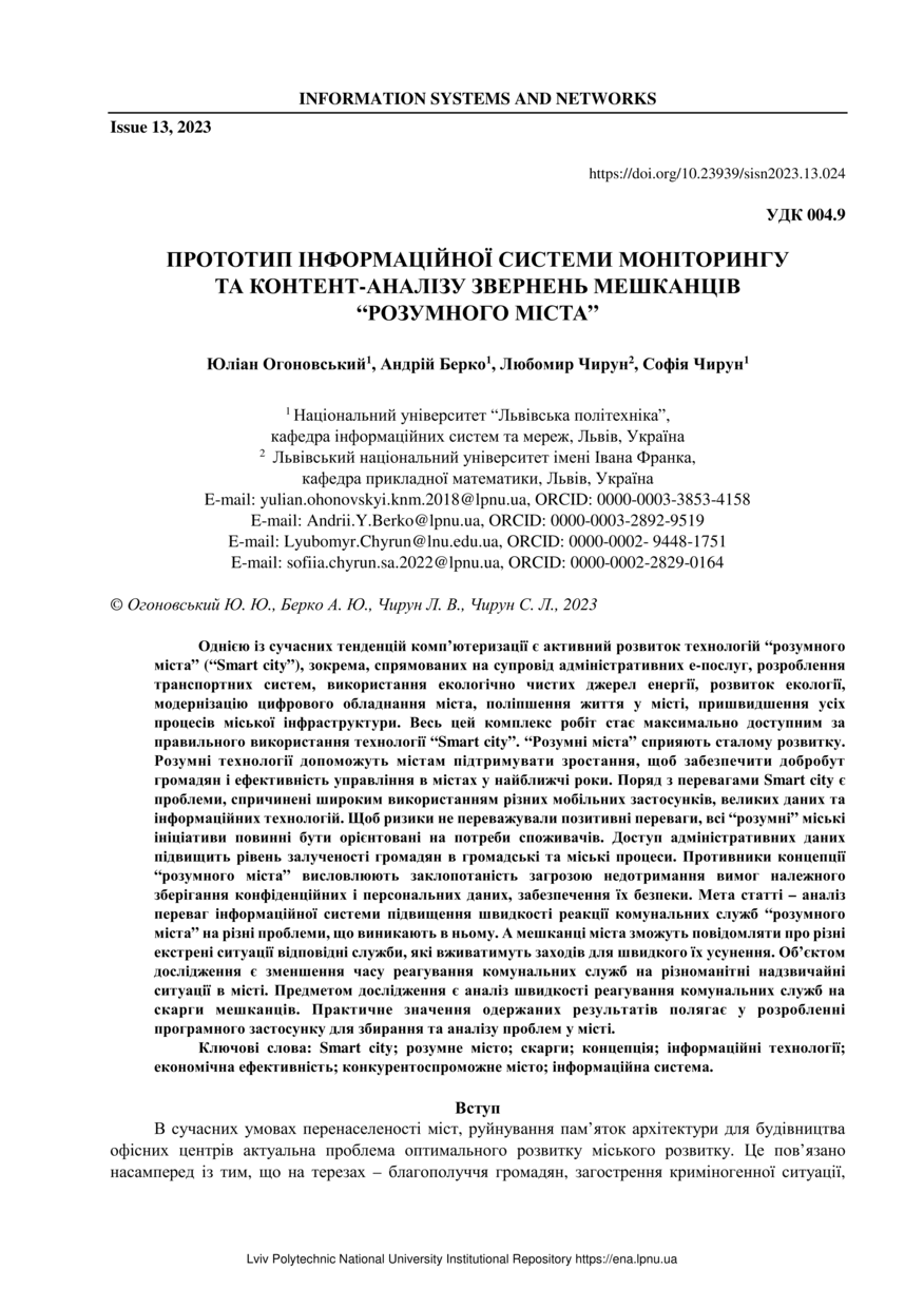 Прототип інформаційної системи моніторингу та контент-аналізу звернень мешканців “розумного міста” / Юліан Огоновський, Андрій Берко, Любомир Чирун, Софія Чирун // Вісник Національного університету "Львівська політехніка". Інформаційні системи та мережі. — Львів : Видавництво Львівської політехніки, 2023. — № 13. — С. 24–45.