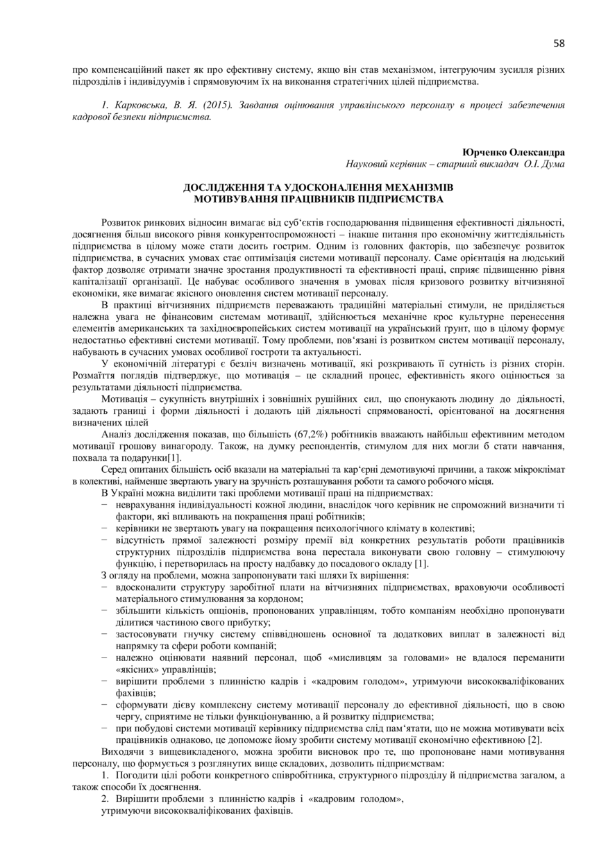 Юрченко О. Дослідження та удосконалення механізмів мотивування працівників підприємства / Олександра Юрченко, О. І. Дума // 77-ма Студентська науково-технічна конференція. Секція "Публічне управління та адміністрування" : збірник тез доповідей, 7 листопада 2019 року, Львів. — Львів : Видавництво Львівської політехніки, 2019. — С. 58–59. — (Адміністративний менеджмент).