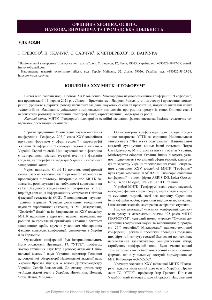 Ювілейна XXV МНТК “Геофорум” / І. Тревого, П. Ткачук, С. Савчук, Б. Четверіков, О. Ванчура // Сучасні досягнення геодезичної науки та виробництва. — Львів : Видавництво Львівської політехніки, 2021. — Том ІІ (42). — С. 5–10.