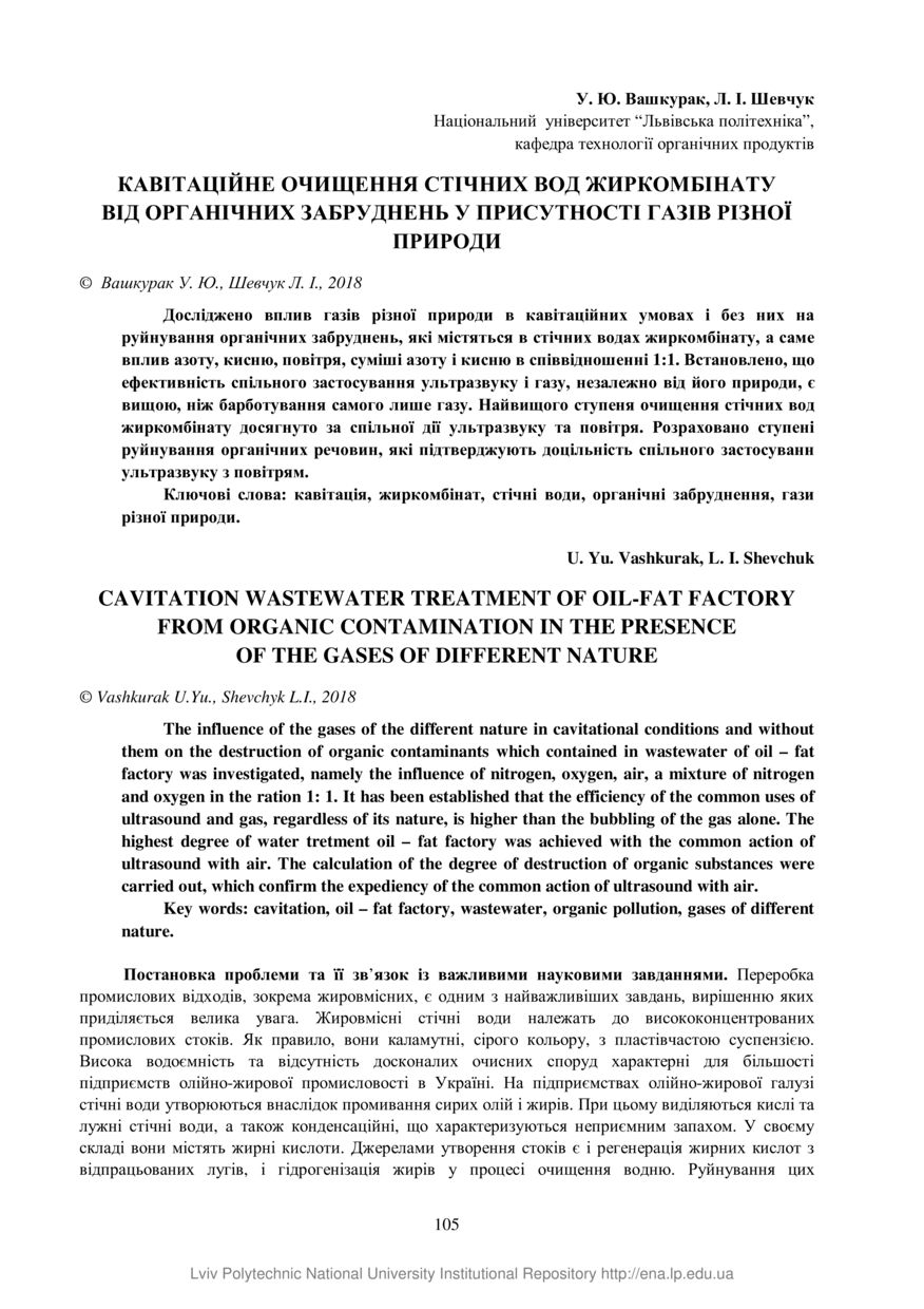 Вашкурак У. Ю. Кавітаційне очищення стічних вод жиркомбінату від органічних забруднень у присутності газів різної природи / У. Ю. Вашкурак, Л. І. Шевчук // Chemistry, Technology and Application of Substance. — Lviv : Lviv Politechnic Publishing House, 2018. — Vol 1. — No 1. — P. 105–110.