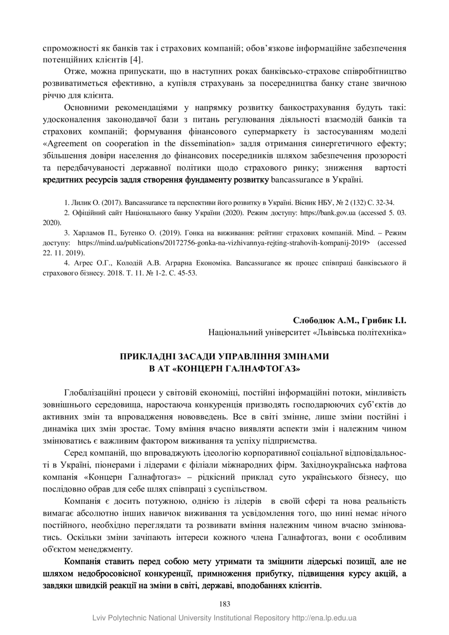 Слободюк А. М. Прикладні засади управління змінами в АТ «Концерн Галнафтогаз» / А. М. Слободюк, І. І. Грибик // Управління інноваційним процесом в Україні: розвиток співпраці : тези доповідей VІІІ Міжнародної науково-практичної конференції, 18–20 червня 2020 року, Львів. — Львів : Видавництво Львівської політехніки, 2020. — С. 183–185. — (Проблеми розвитку співпраці в інноваційних процесах).