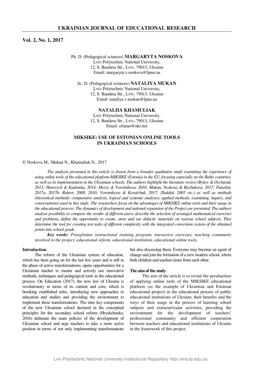 Noskova M. Miksike: USE of Estonian online tools in Ukrainian schools / Margaryta Noskova, Nataliya Mukan, Nataliia Khamuliak // Ukrainian Journal of Educational Research. — Lviv : Lviv Politechnic Publishing House, 2017. — Vol 2. — No 1. — P. 29–32.