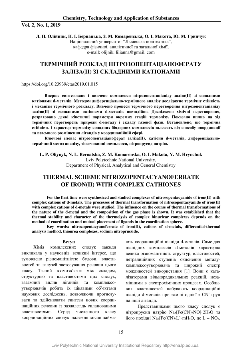| dc.identifier.citationen | Study of the thermal scheme process nitrozopentacyanoferrate of iron (II) with complex cathiones / L. P. Oliynyk, N. L. Bernatska, Z. M. Komarenska, O. I. Makota, Y. M. Hrynchuk // Chemistry, Technology and Application of Substances. — Lviv : Lviv Politechnic Publishing House, 2019. — Vol 2. — No 1. — P. 15–21. | |