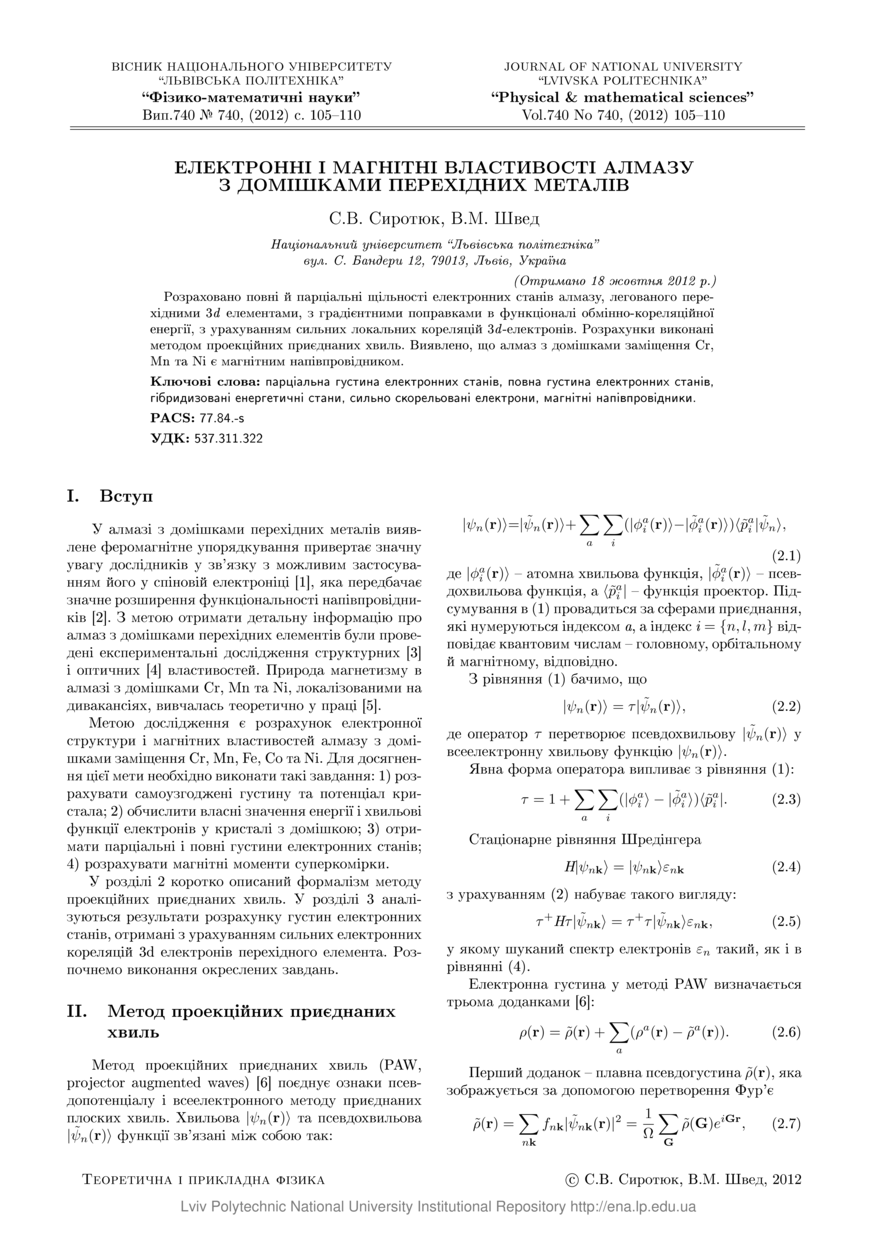 Сиротюк С. В. Електронні і магнітні властивості алмазу з домішками перехідних металів / С. В. Сиротюк, В. М. Швед // Вісник Національного університету “Львівська політехніка”. — Львів : Видавництво Львівської політехніки, 2012. — № 740 : Фізико-математичні науки. — С. 105–110.