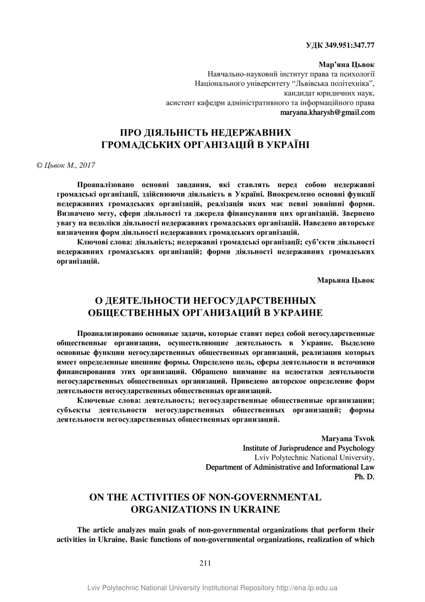 Цьвок М. Про діяльність недержавних громадських організацій в Україні / Мар’яна Цьвок // Вісник Національного університету «Львівська політехніка». Серія: Юридичні науки : збірник наукових праць. — Львів : Видавництво Львівської політехніки, 2017. — № 876. — С. 211–218.