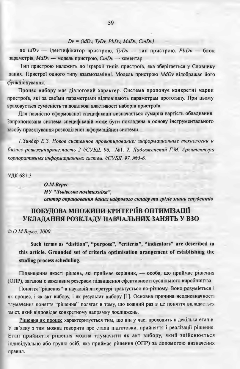 Верес О. М. Побудова множини критеріїв оптимізації укладання розкладу навчальних занять у ВЗО / О. М. Верес // Вісник Національного університету “Львівська політехніка”. — Львів : Видавництво Національного університету “Львівська політехніка”, 2000. — № 406 : Інформаційні системи та мережі. — С. 59–65.
