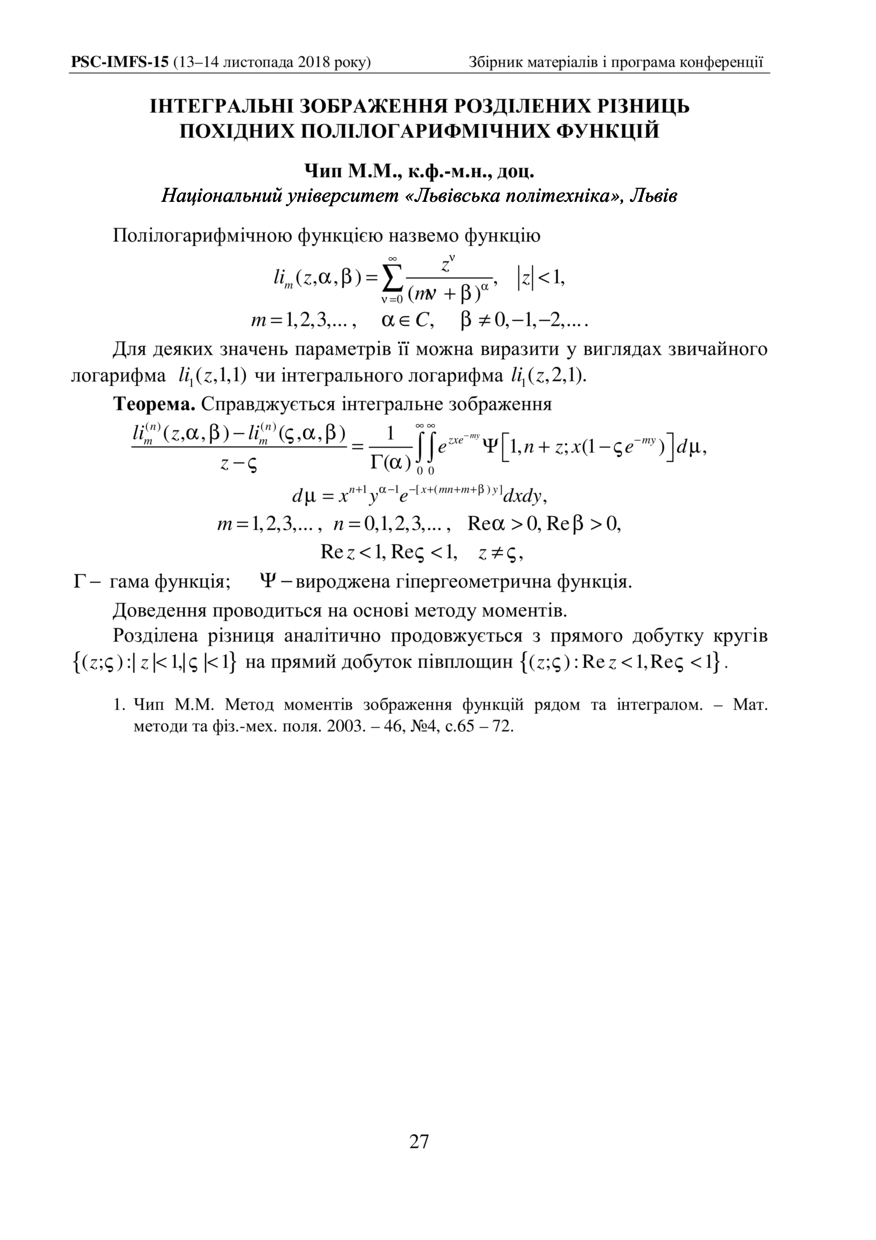 Чип М. М. Інтегральні зображення розділених різниць похідних полілогарифмічних функцій / М. М. Чип // 15-та Відкрита наукова конференція Інституту прикладної математики та фундаментальних наук (ІМФН) : збірник матеріалів і програма конференції, 13–14 листопада 2018 року, Львів. — Львів : Видавництво Львівської політехніки, 2018. — С. 27. — (Математика).