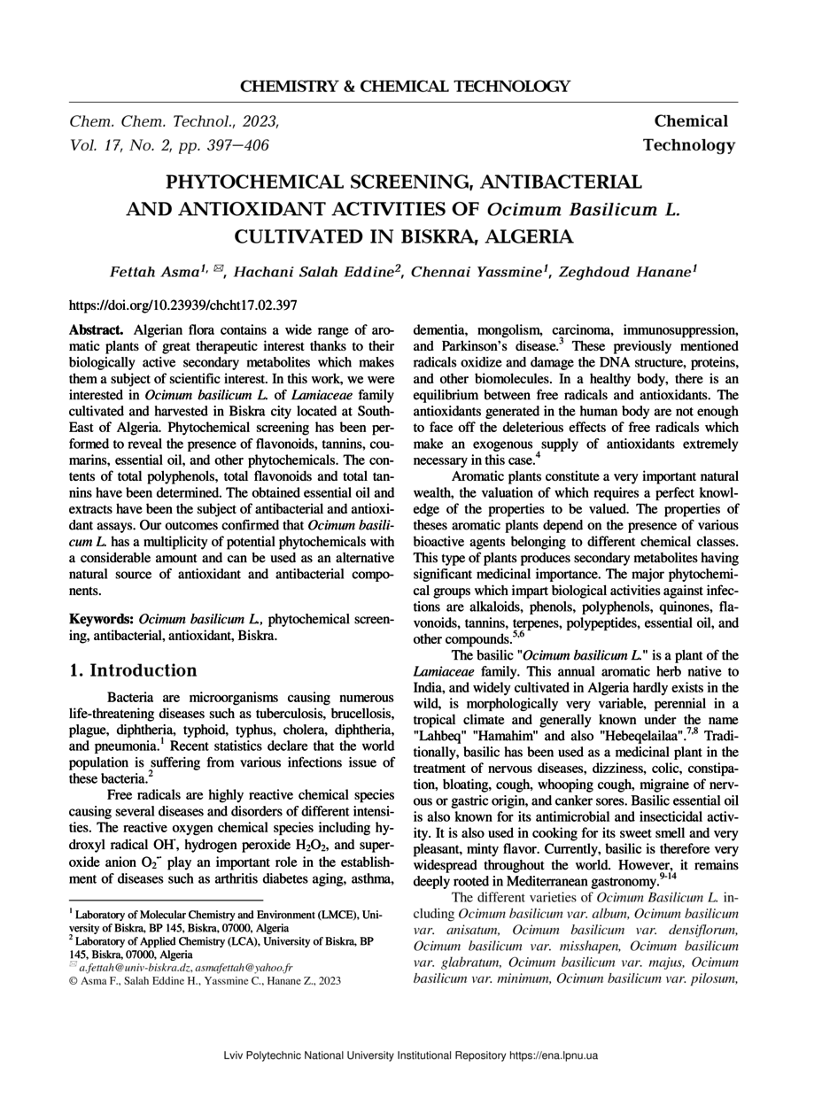Phytochemical Screening, Antibacterial and Antioxidant Activities of Ocimum basilicum L. Cultivated in Biskra, Algeria / Fettah Asma, Hachani Salah Eddine, Chennai Yassmine, Zeghdoud Hanane // Chemistry & Chemical Technology. — Lviv : Lviv Politechnic Publishing House, 2023. — Vol 17. — No 2. — P. 397–406.