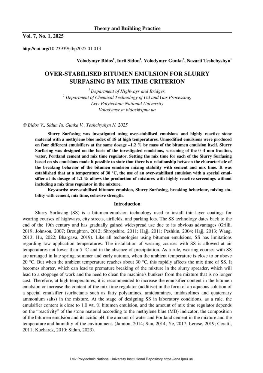 Over-stabilised bitumen emulsion for slurry surfasing by mix time criterion / Volodymyr Bidos, Iurii Sidun, Volodymyr Gunka, Nazarii Teshchyshyn // Theory and Building Practice. — Lviv : Lviv Politechnic Publishing House, 2025. — Vol 7. — No 1. — P. 13–18.