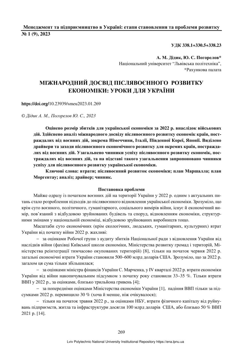 Дідик А. М. Міжнародний досвід післявоєнного розвитку економіки: уроки для України / А. М. Дідик, Ю. С. Погорелов // Менеджмент та підприємництво в Україні: етапи становлення і проблеми розвитку. — Львів : Видавництво Львівської політехніки, 2023. — Том 5. — № 1. — С. 269–282.