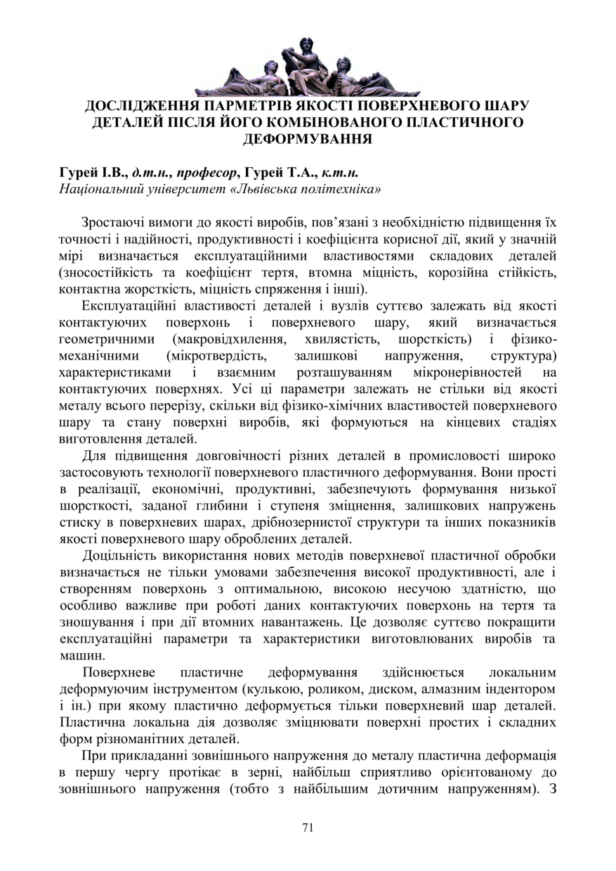 Гурей І. В. Дослідження парметрів якості поверхневого шару деталей після його комбінованого пластичного деформування / І. В. Гурей, Т. А. Гурей // Прогресивні технології в машинобудуванні : збірник наукових праць IХ-ої Міжнародної науково-технічної конференції, 03-07 лютого 2020 року, Львів-Плай. — Львів, 2020. — С. 71–75.