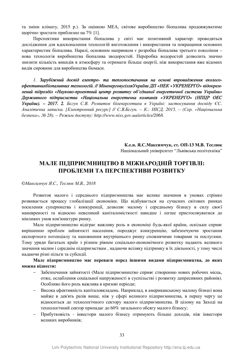 | dc.identifier.citationen | Maksimchuk Ia. S. Male pidpryiemnytstvo v mizhnarodnii torhivli: problemy ta perspektyvy rozvytku / Ia. S. Maksimchuk, M. V. Tesliuk // Problemy ekonomiky, finansiv ta upravlinnia eksportno-importnoiu diialnistiu : materialy III Mizhnarodnoi naukovo-praktychnoi internet-konferentsii, 16 travnia 2018 roku Lviv. — Lviv : Vydavnytstvo Lvivskoi politekhniky, 2018. — P. 33–34. — (Ekonomika eksportno-importnoi diialnosti). | |