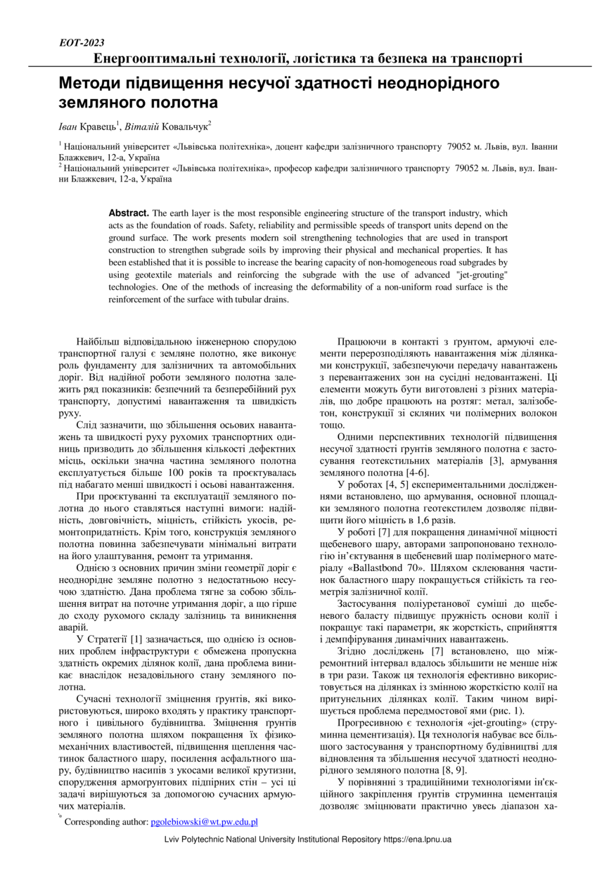 Кравець І. Методи підвищення несучої здатності неоднорідного земляного полотна / Іван Кравець, Віталій Ковальчук // Енергооптимальні технології, логістика та безпека на транспорті : матеріали 3-ї Міжнародної науково-практичної конференції, 9-10 листопада 2023 року. — Львів : Видавництво Львівської політехніки, 2023. — С. 36–38.