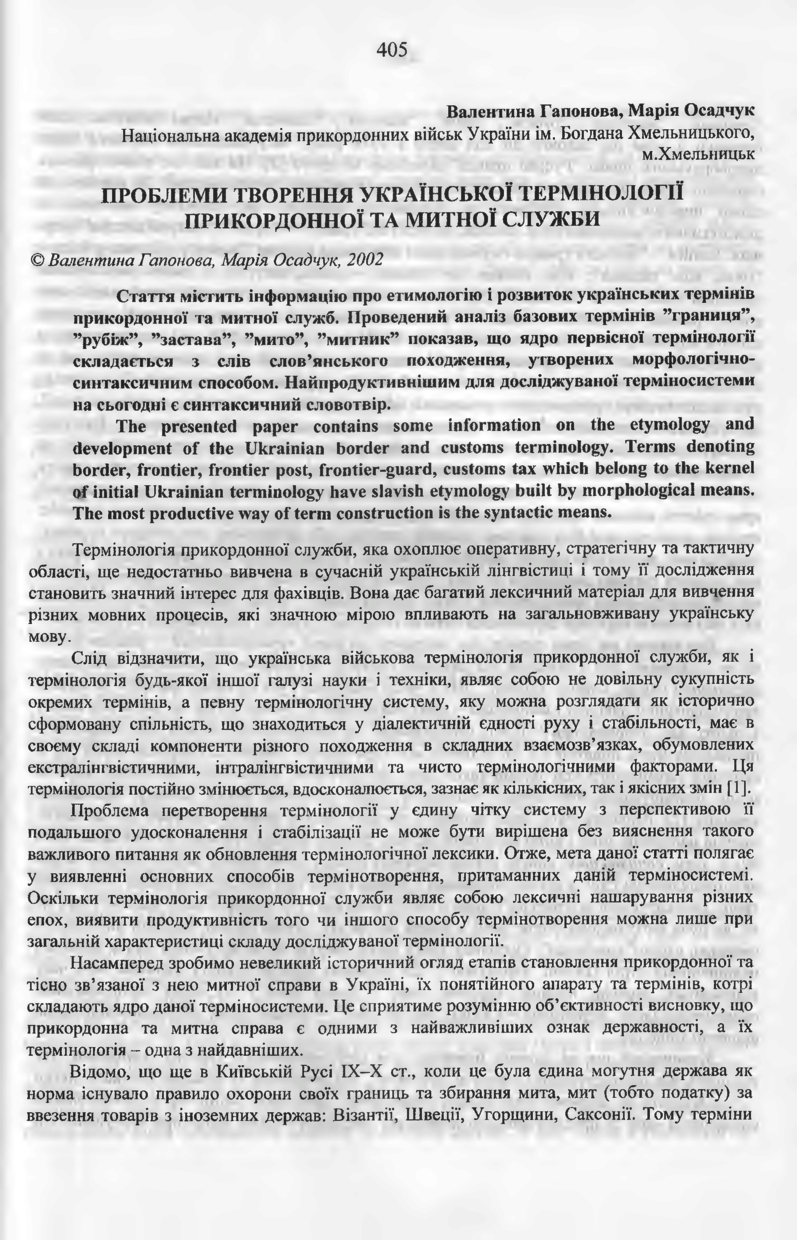 Гапонова В. Проблеми творення української термінології прикордонної та митної служби / Валентина Гапонова, Марія Осадчук // Вісник Національного університету “Львівська політехніка”. — Львів : Видавництво Національного університету “Львівська політехніка”, 2002. — № 453 : Проблеми української термінології. — С. 405–410. — (Термінологія гуманітарних знань).
