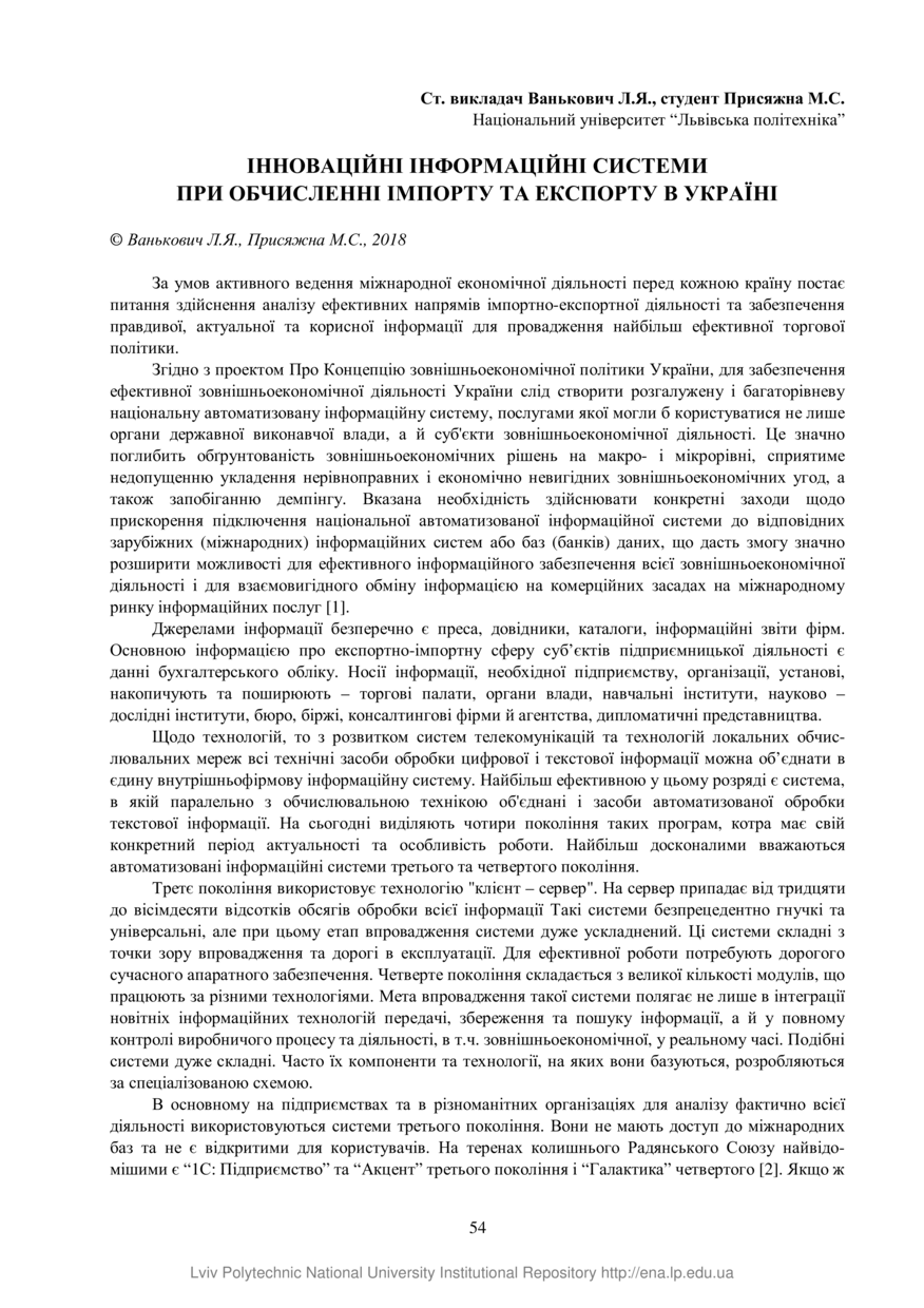 Ванькович Л. Я. Інноваційні інформаційні системи при обчисленні імпорту та експорту в Україні / Л. Я. Ванькович, М. С. Присяжна // Проблеми економіки, фінансів та управління експортно-імпортною діяльністю : матеріали ІІІ Міжнародної науково-практичної інтернет-конференції, 16 травня 2018 року Львів. — Львів : Видавництво Львівської політехніки, 2018. — С. 54–55. — (Інформаційне забезпечення експортно-імпортної діяльності).