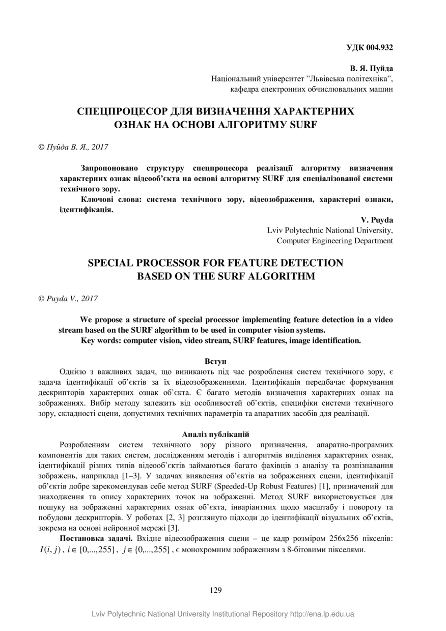 Пуйда В. Я. Спецпроцесор для визначення характерних ознак на основі алгоритму SURF / В. Я. Пуйда // Вісник Національного університету «Львівська політехніка». Серія: Комп’ютерні системи та мережі. — Львів : Видавництво Львівської політехніки, 2017. — № 881. — С. 129–134.