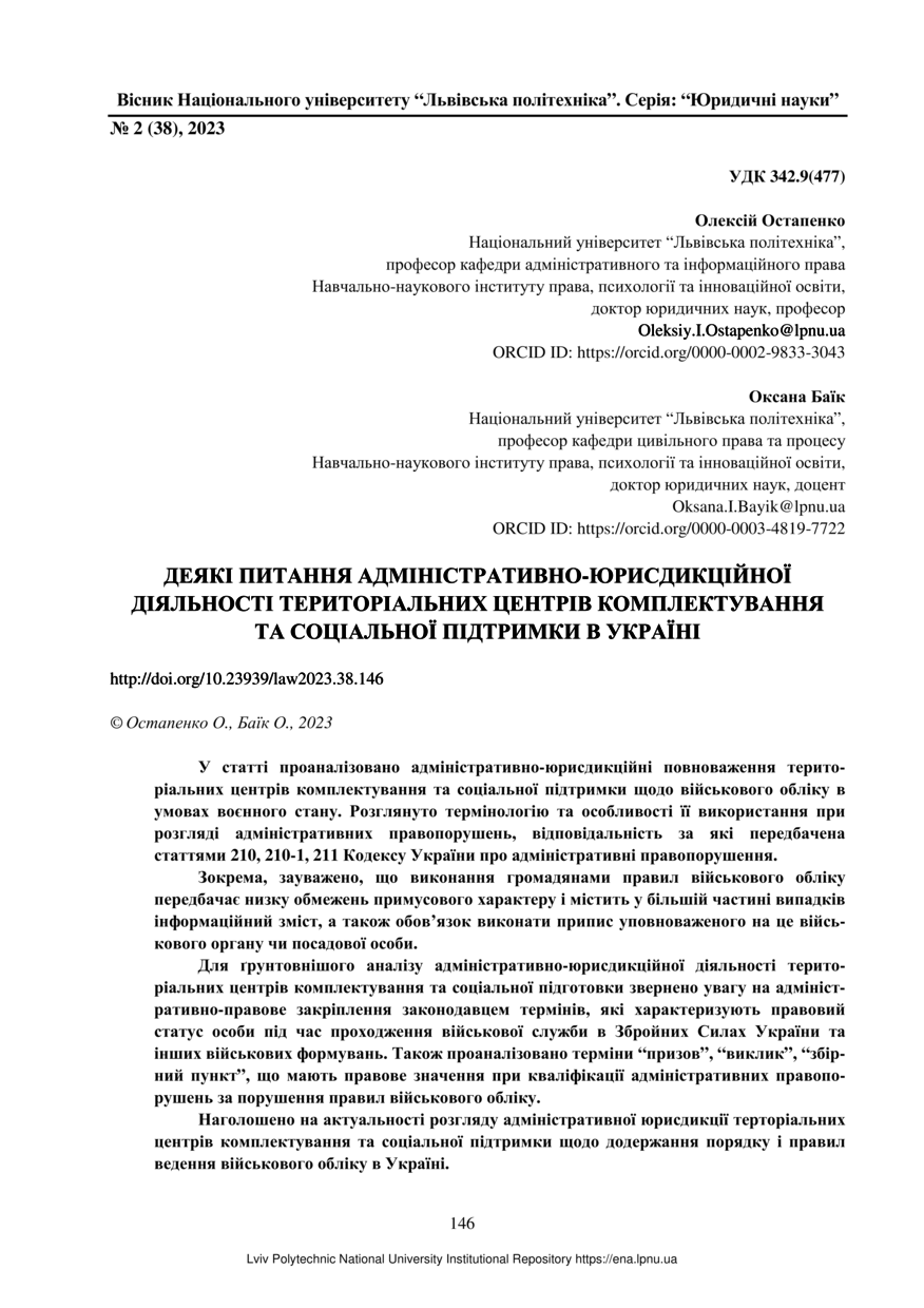 Остапенко О. Деякі питання адміністративно-юрисдикційної діяльності територіальних центрів комплектування та соціальної підтримки в Україні / Олексій Остапенко, Оксана Баїк // Вісник Національного університету “Львівська політехніка”. Серія: “Юридичні науки”. — Львів : Видавництво Львівської політехніки, 2023. — № 2 (38). — С. 146–154.