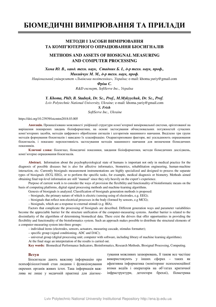 | dc.description.abstract | Information about the psychophysiological state of humans is important not only in medical practice for the diagnosis of possible diseases but is also for affective informatics, biometrics, rehabilitation engineering, human-machine interaction, etc. Currently biosignals measurement instrumentations are highly specialized and designed to process the separate types of biosignals (ECG, EEG), or to perform the specific tasks, for example, medical diagnosis or biometry. Methods aimed obtaining final top-level information are still "manual" since they rely heavily on the expert’s experience. Purpose of current work is to consider the ways of provision the flexibility and functionality of bioinformatic means on the basis of computing platforms, digital signal processing methods and machine-learning algorithms. Genesis of biosignals is analyzed. Classification of biosignals generation methods is proposed: – biosignals, the primary nature of which is electric (sensing using of electrodes, e.g. EEG); – biosignals that reflect non-electrical processes in the body (formed by sensors, e.g MCG); – biosignals, which are a response to external stimuli (e.g. BIA). Factors that complicate the processing of biosignals are described. Different generation ways and parameter variabilities become the appreciable barrier for the structure unification of the computer-measuring systems. Another barrier is related to the dissimilarity of the algorithms of determining biomedical data. There exist the drivers that offer opportunities in providing the flexibility and functionality of the bioinformatics system. Such an approach makes possible to distribute the structural elements of a computer-measuring system into three groups: – individual items (electrodes, sensors, actuators, measuring cascade, stimulus formatter); – specific group (signal conditioning, ADC and DAC); – universal group (digital processing unit; computer with software, including library of machine learning algorithms). At the final stage an interpretation of the results is carried out. | |