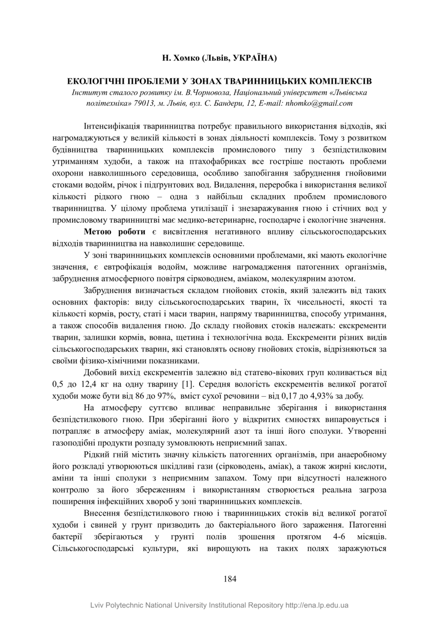 Хомко Н. Екологічні проблеми у зонах тваринницьких комплексів / Н. Хомко // Сталий розвиток – стан та перспективи : матеріали міжнародного наукового симпозіуму SDEV‘2018, Львів-Славське, Україна, 28 лютого–3 березня 2018 року. — Львів : Панорама, 2018. — С. 184–185. — (Технології захисту довкілля для сталого розвитку).